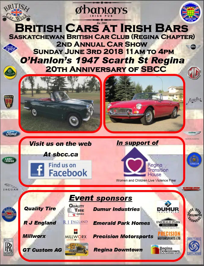 Car Show put on by the Sask British Car Club. The public is welcome, no admission is charged. There will be a donation jar with all donations welcomed and going to support Regina Transition House